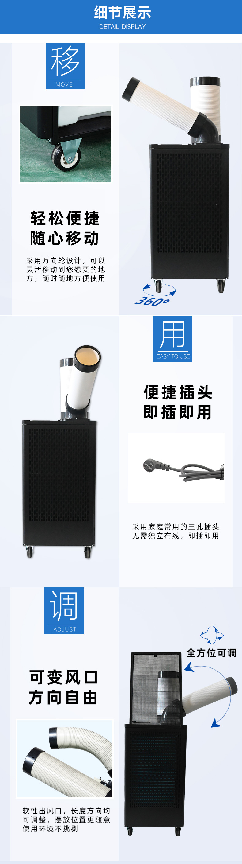 6、兩個(gè)冷風(fēng)口均可270度旋轉,適用于3-5個(gè)崗位的降溫