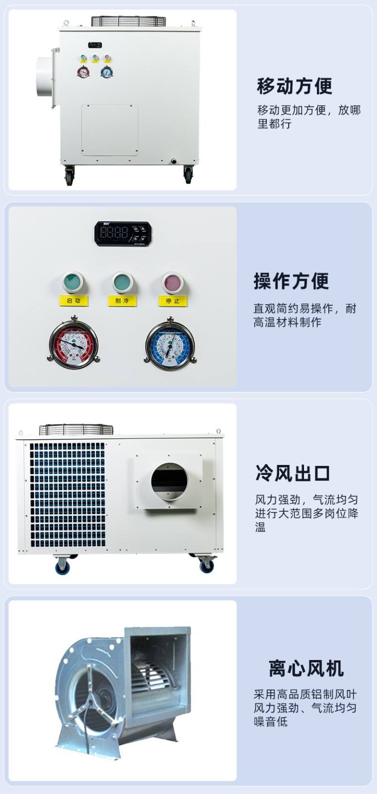6、兩個(gè)冷風(fēng)口均可270度旋轉,適用于3-5個(gè)崗位的降溫